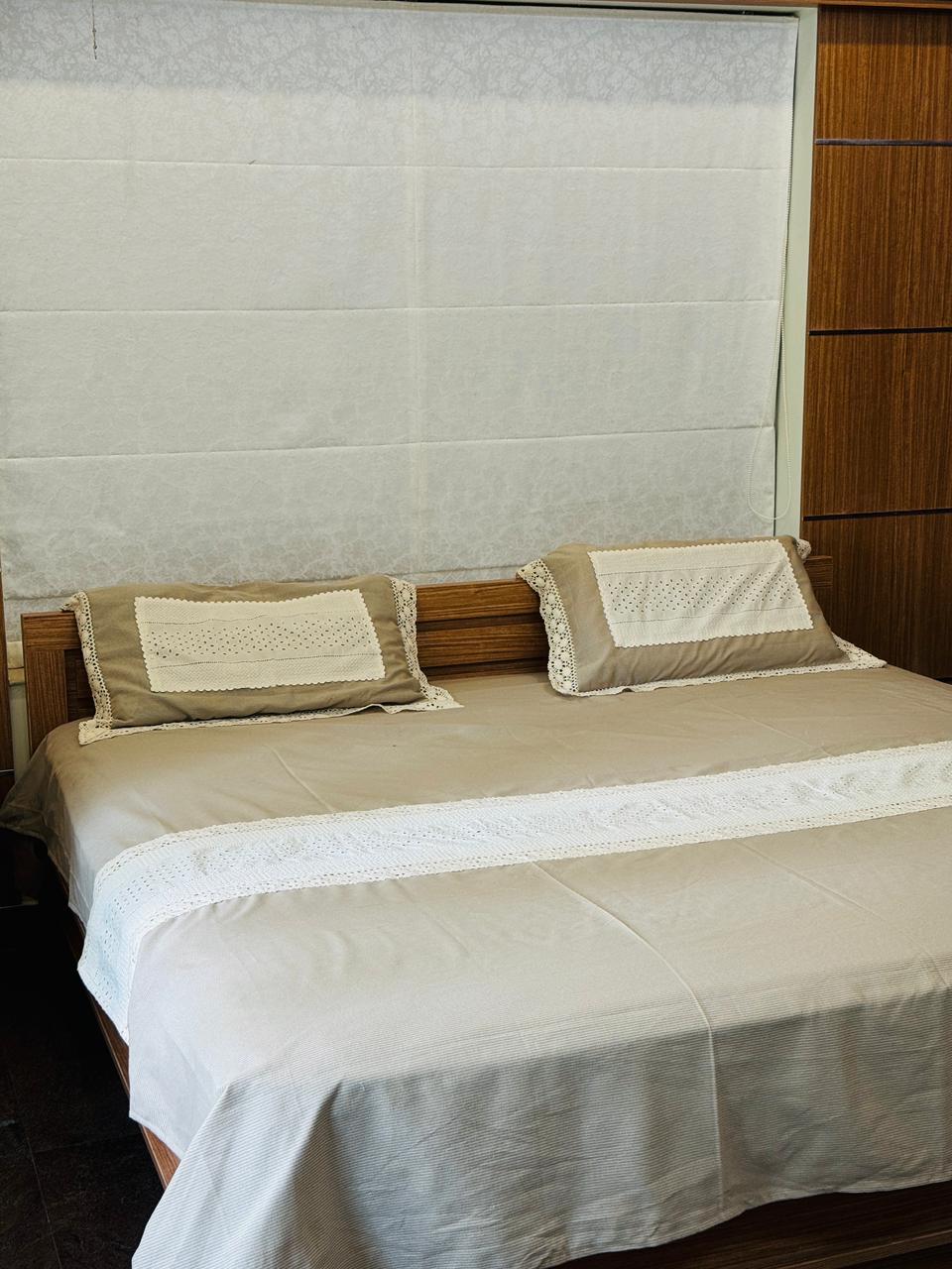 Enhance your bedroom with this elegant Hakoba and crochet lace bedset. Crafted in soft, neutral tones, it features delicate Hakoba embroidery complemented by refined crochet lace detailing for a timeless, handcrafted look. Comfortable and graceful, this bedset adds a touch of classic charm and understated luxury to your everyday living space.
