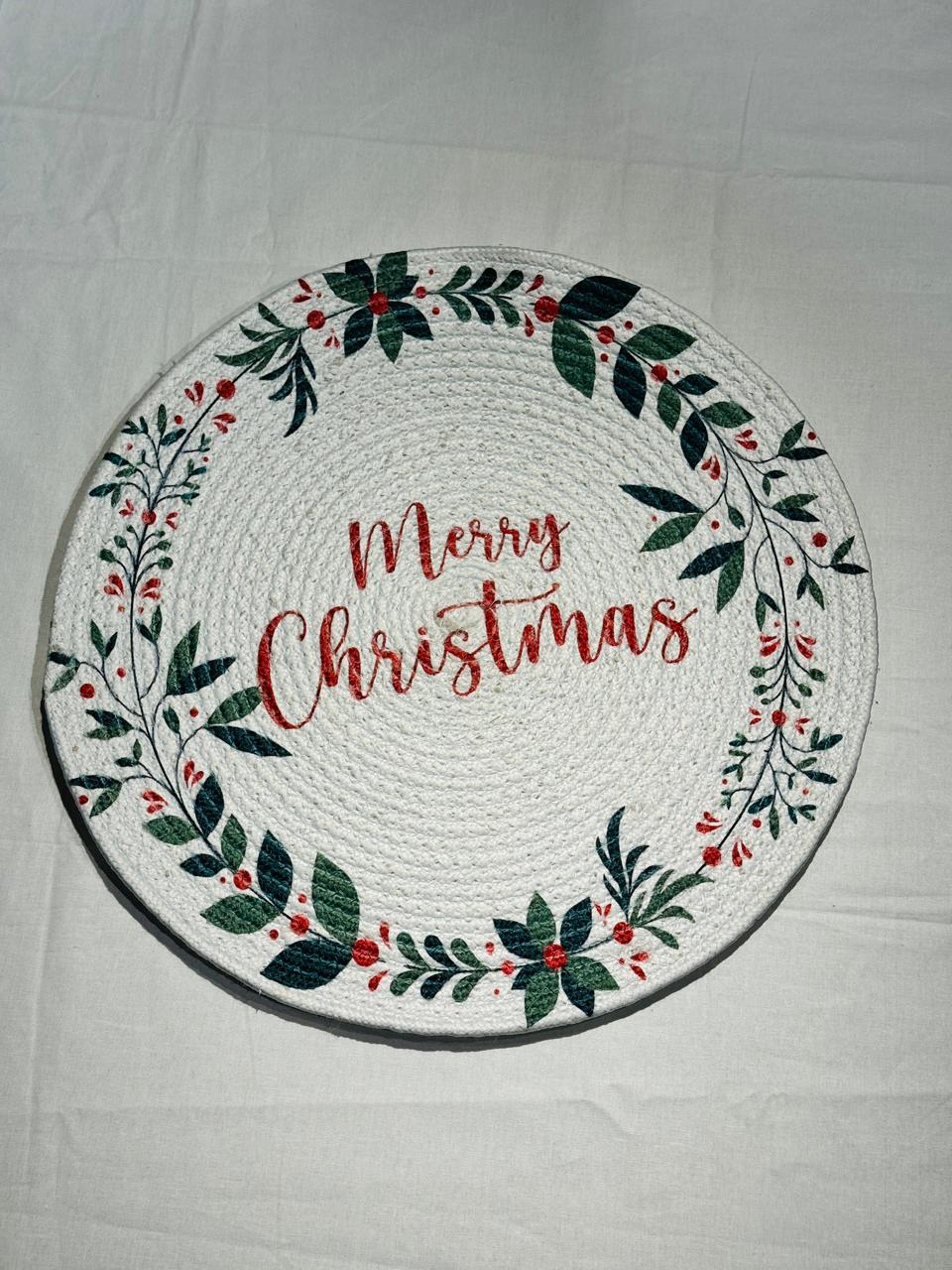 Add a touch of festive elegance to your décor with this round braided Christmas mat. Featuring a charming “Merry Christmas” message in bright red and surrounded by beautiful holiday foliage, it brings seasonal warmth to any room. The soft white base with green and red accents makes it perfect for table settings, entryways, or gifting during the celebrations. Durable, stylish, and crafted for holiday cheer.