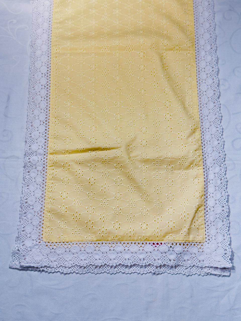 Add a touch of elegance to your dining space with this Hakoba Table Runner (15×72 inches) with lace border. Crafted from soft, high-quality fabric, it features delicate Hakoba embroidery complemented by graceful lace edging, bringing a refined and timeless charm to your table décor. Perfect for dining tables, consoles, or coffee tables, this runner enhances your setting with a beautiful handcrafted look while protecting surfaces in style.